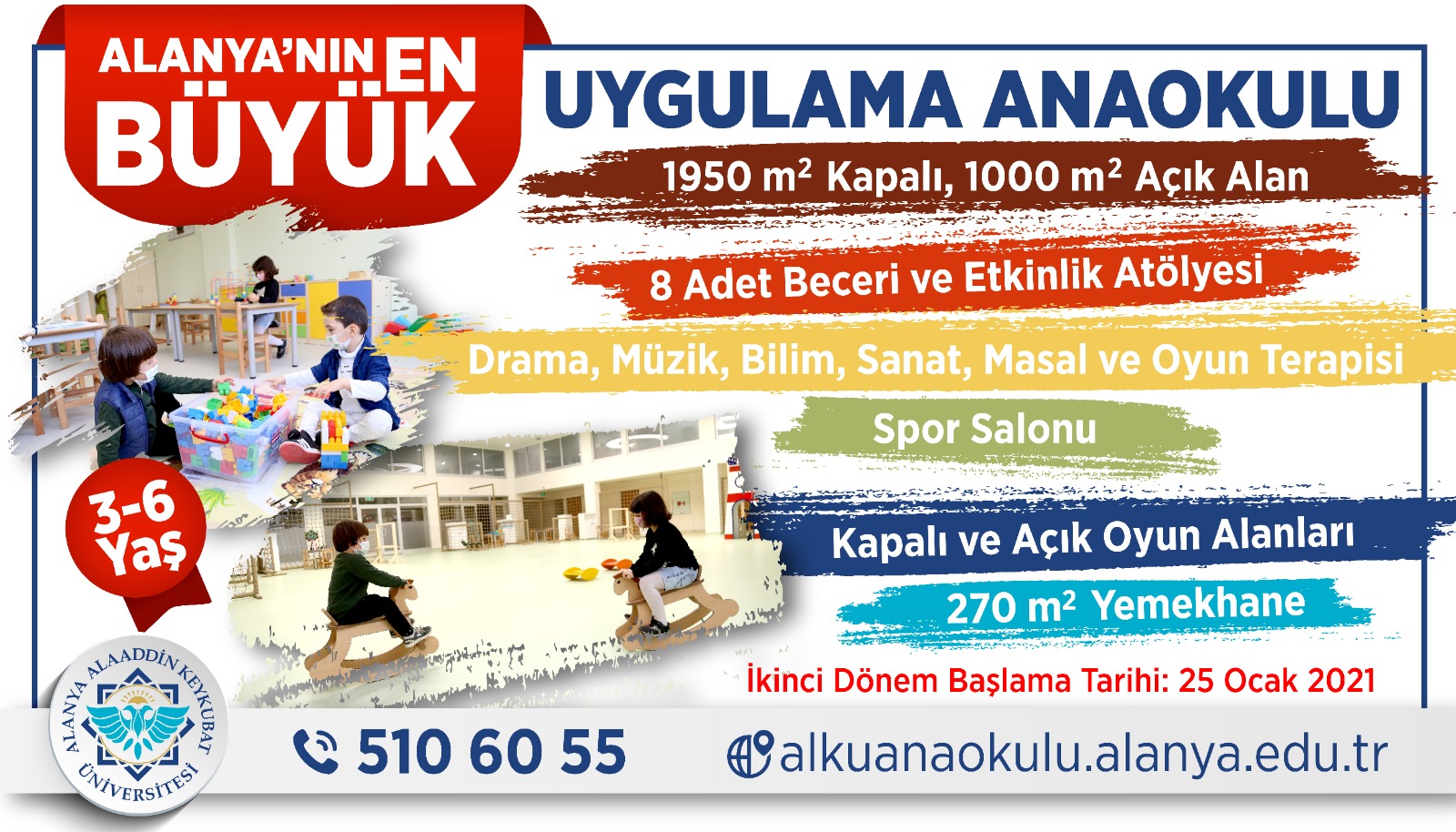 Alanya Alaaddin Keykubat Üniversitesi (ALKÜ) ALKÜ Uygulama Anaokulu faaliyetlerine başlıyor. Bin 950 metrekare kapalı, bin metrekare açık alanıyla Alanya’nın en büyük uygulama anaokulunu hayata geçiren ALKÜ, geniş, ferah, güvenliği en üst seviyede ve akademiyle bütünleşen eğitimiyle adından söz ettirmeye hazırlanıyor. 3-6 yaş grubunun kayıtlarını alan ALKÜ Uygulamalı Anaokulu’nun, ALKÜ personellerinin yanı sıra Alanya’daki vatandaşların da hizmetine açık olduğu belirtildi.