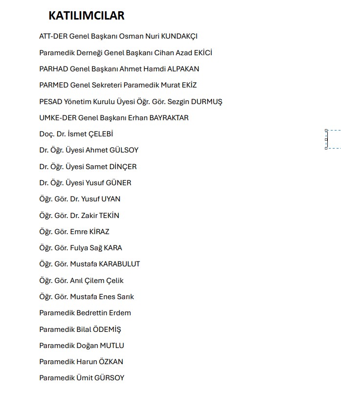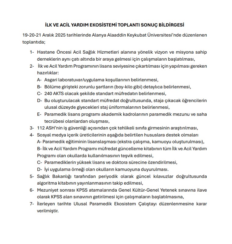 Söz konusu toplantı, Alanya Alaaddin Keykubat Üniversitesi ev sahipliğinde; paramedik dernekleri, alan akademisyenleri ve sosyal medya içerik üreticisi paramediklerin katılımıyla yapılmıştır. Toplantı kapsamında, paramedik mesleğinin mevcut durumu değerlendirilmiş; mesleki gelişim, akademik katkı ve saha uygulamalarına yönelik atılması gereken adımlar belirlenmiştir.