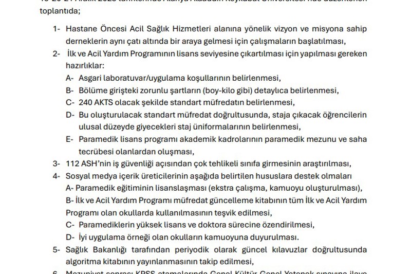 Söz konusu toplantı, Alanya Alaaddin Keykubat Üniversitesi ev sahipliğinde; paramedik dernekleri, alan akademisyenleri ve sosyal medya içerik üreticisi paramediklerin katılımıyla yapılmıştır. Toplantı kapsamında, paramedik mesleğinin mevcut durumu değerlendirilmiş; mesleki gelişim, akademik katkı ve saha uygulamalarına yönelik atılması gereken adımlar belirlenmiştir.