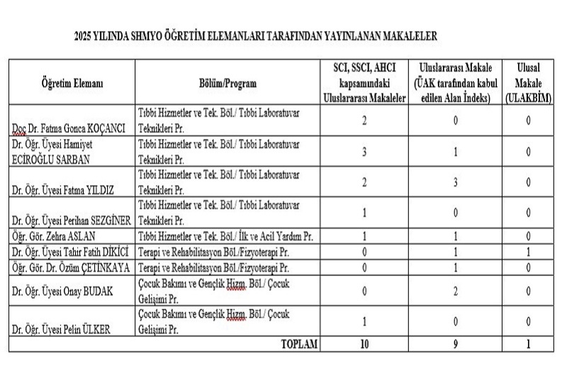 SHMYO bünyesinde görev yapan Doç. Dr. Fatma Gonca Koçancı, Dr. Öğr. Üyesi Hamiyet Eciroğlu Sarban, Dr. Öğr. Üyesi Fatma Yıldız, Dr. Öğr. Üyesi Tahir Fatih Dikici, Dr. Öğr. Üyesi Onay Budak, Dr. Öğr. Üyesi Perihan Sezginer, Dr. Öğr. Üyesi Pelin Ülker ile Öğr. Gör. Dr. Özüm Çetinkaya ve Öğr. Gör. Zehra Aslan’ın yer aldığı bu akademik üretkenlik tablosu, SHMYO’nun disiplinler arası ve nitelikli araştırma altyapısını açık biçimde yansıtmaktadır