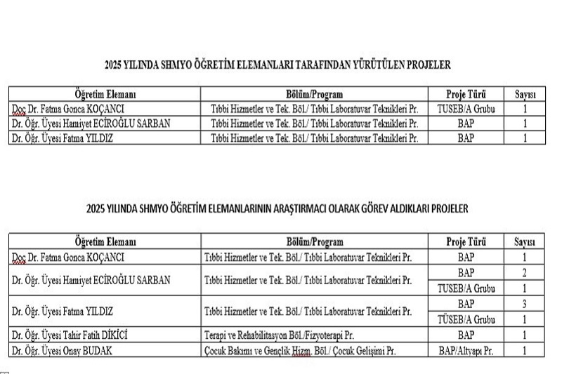 2025 yılı verilerine göre SHMYO öğretim elemanları tarafından TÜSEB ve BAP destekli çok sayıda proje yürütüldü. Akademisyenler hem yürütücü hem de araştırmacı olarak görev aldıkları projelerle sağlık bilimleri, çocuk gelişimi, fizyoterapi ve temel tıp bilimleri alanlarında üniversitenin araştırma portföyüne önemli katkılar sağladı.